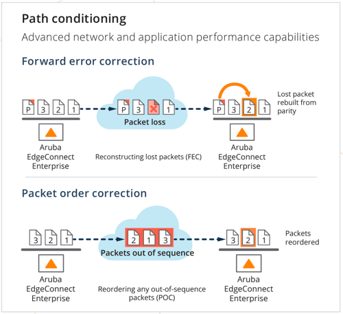 5. Aruba EdgeConnnect ความสามารถทำ Path Conditioning ทำให้เหนือกว่า SD-WAN ทั่วไป โดยที่ Path Conditioning ที่จะช่วยปรับให้การเชื่อมต่อ Internet ทั่วไปนั้นมีความเสถียรมากขึ้นเทียบเคียงได้กับการใช้ Private Link โดยใช้ Forward Error Correction (FEC) , Packet Order Correction (POC)