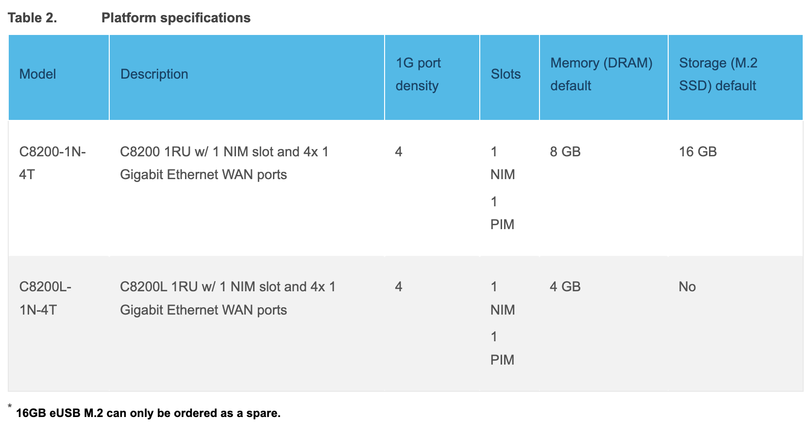 The C8200L-1N-4T does not ship with a default M.2 storage but can be upgraded to 16G, 32G USB and to 600G M.2 Non-Volatile Memory Express (NVMe) Storage