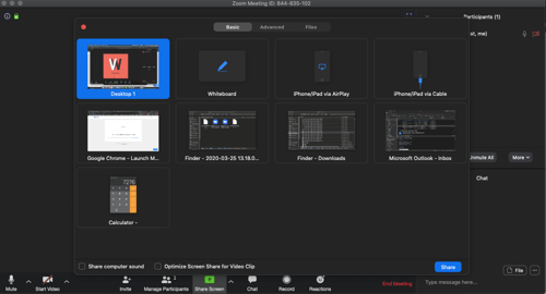 ในส่วน Basic สามารถเลือก Content จากหน้าต่าง หรือ Application ต่างๆ ที่เราจะ Share รวมถึงมี Whiteboard เอาไว้ในกรณีต้องการเขียน