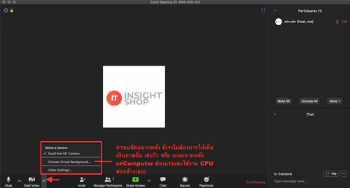ปุ่ม Start Video (เปิด / ปิด Video) และยังสามารถเลือก Source ของกล้อง VDO ได้ แถมยังทำ Virtual Backgroud ได้ (กิน CPU ค่อนข้างเยอะ)