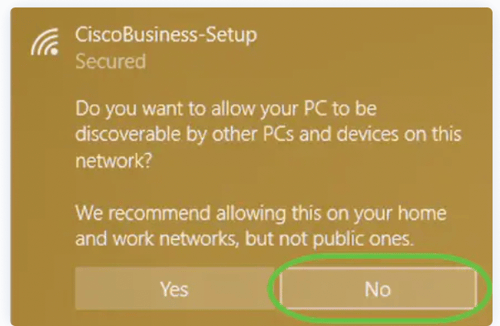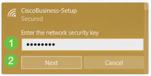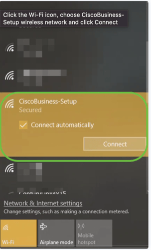 2. รอประมาณ 8 - 10 นาที ระหว่างนั้น Access Point จะมีไฟกระพริบสลับสีเขียว , สีแดง และ สีน้ำตาลเหลือง รอจน Access point กระพริบแค่สีเขียว ให้สังเกต wifi ที่คอมพิวเตอร์ จะมี SSID CiscoBusiness-Setup ขึ้นมา ให้กด Connect