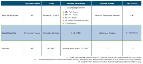 Cisco มีประกันอยู่หลายรูปแบบ ทั้งที่เป็น Warranty ที่ติดมากับตัวสินค้า อีกทั้งยังสามารถซื้อเพิ่มเติมได้ ไม่ว่าจะเป็น Smart Net, Support Essentials ซึ่งหลายๆคนนั้นก็มีความสับสนว่าควรเลือกซื้อ Service อะไรดี บทความนี้เป็นบทความที่เปรียบเทียบความแตกต่างระหว่าง Smart Net Total Care, Support Essentials และ Warranty