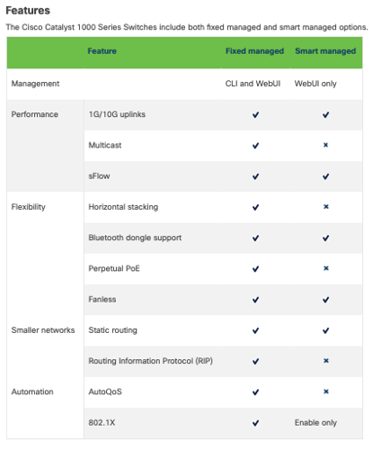 ตารางเปรียบเทียบความแตกต่างของ Catalyst 1000 Series Smart Managed และ Fixed Managed