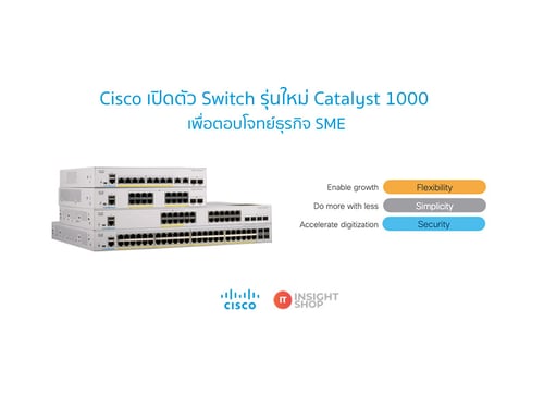 Cisco เปิดตัว Switch รุ่นใหม่ Catalyst 1000 ซึ่งมีการอัปเกรตจากรุ่นเดิมคือ C2960-L และ 2960+ โดยสามารถรองรับการใช้งานได้ถึง 250 คน ถูกออกแบบมาเพื่อตอบโจทย์ธุรกิจขนาดเล็กและธุรกิจที่มีการเปลี่ยนแปลงไว